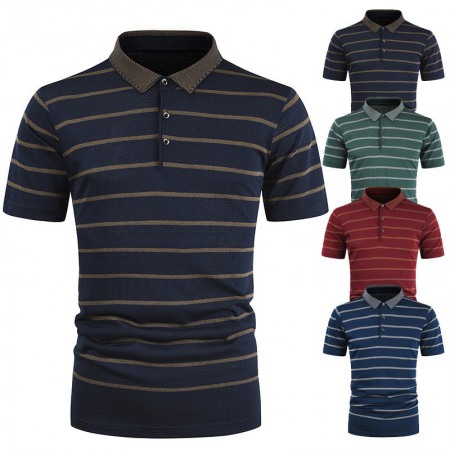 New Summer Men's Striped T-Shirt Mens Lapel Casual Short Sleeves